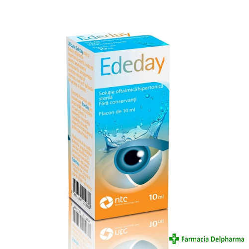 Ededay picaturi oftalmice hipertonice x 10 mlProprietati:- este o solutie oftalmica hipertonica sterila, indicata pentru ameliorarea temporara a simptomelor asociate edemului cornean, cum ar fi tulburari de vedere si durere;- datorita formulei sale i...