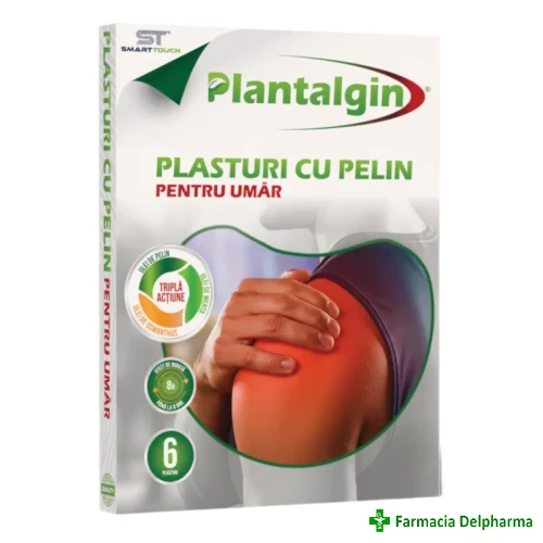 Plasturi cu Pelin pentru zona umarului x 6 bucatiProprietati:- contine uleiuri esentiale naturale ce intra rapid in piele si stimuleaza intens circulatia zonei;- actiune rapida si efect indelungat;- material fara cusaturi indicat chiar si pentru piel...