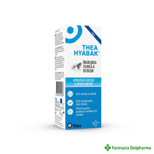 Thea Hyabak 0.15% picaturi oftalmice x 10 mlProprietati:- recomandat pentru lubrifierea ochiului in caz de senzatii de uscaciune sau ochi obositi cauzate de factori externi (vant, fum, poluare, caldura uscata, aer conditionat sau expunerea prelungita...