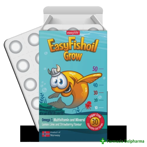 EasyFishoil Grow x 30 comprimate masticabileEasy Fishoil Grow supliment alimentar cu Omega 3, multivitamine și minerale cu îndulcitor. Beneficii:Acizii grași Omega-3 sunt esențiali pentru organism.Deoarece nu poate fi sintetizat de organism...