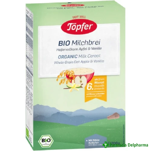 Cereale Topfer Bio ovaz cu lapte, mere si vanilie (6+) x 200 gAceste cereale sunt produse din ingrediente de origine organica. Acestea sunt prelucrate delicat, fiind potrivite pentru nevoile nutritionale ale copilului in cazul unei alimentatii divers...