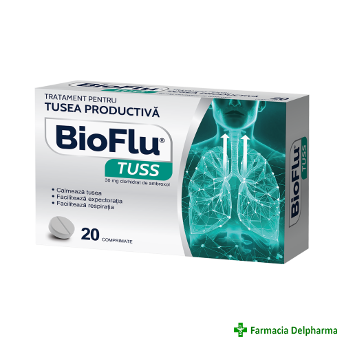 BioFlu Tuss 30 mg x 20 comprimateIndicatii:Bioflu Tuss 30 mg comprimate este un medicament mucolitic care determină creşterea cantităţii de spută expectorată şi îi scade vâscozitatea. Amelioreazătransportul bronşic, reduce tusea şi uşurează respiraţi...