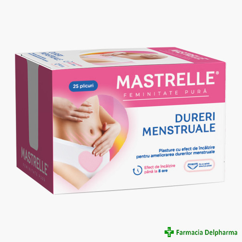 Mastrelle plasturi pentru dureri menstruale x 25 bucatiProprietati:- forma speciala a plasturilor pentru dureri menstruale asigura aplicarea indiferent de zona si moment al zilei, oferind libertate de miscare;- plasturele poate fi utilizat ca tratame...