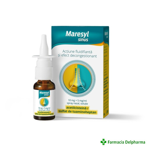 Maresyl Sinus spray nazal 10 mg+5 mg/ml x 10 mlIndicatii:MARESYL SINUS este un spray nazal utilizat local, ca decongestionant în cazul:- rinitelor acute şi subacute, cu secreţii excesive şi mucopurulente;- rinitelor cronice şi mucocrustoase;- rinitel...