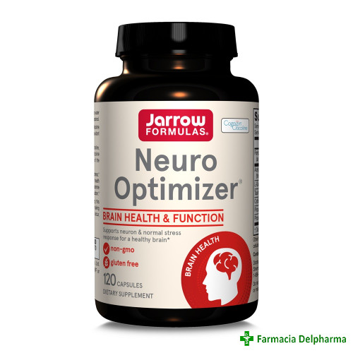 Neuro Optimizer Jarrow Formulas x 120 capsuleFormula complexa ce contine Cognizin® (forma de citicolina patentata), ingredient studiat clinic, ce sustine sistemul nervos, imbunatatirea memoriei, a concentrarii, a atentiei si ofera protectie antioxida...
