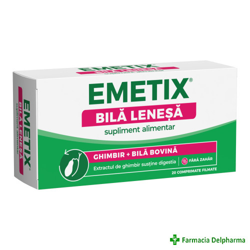 Emetix bila lenesa x 20 comprimateProprietati:- poate contribui la digestia grăsimilor și la înlăturarea senzației de greață;- filmul comprimatelor oferă protecție ingredientelor, iar acestea trec nealterate de sucul gastric și ajung acolo unde este ...