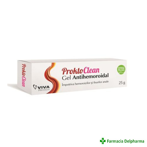 ProktoClean gel antihemoroidal x 25 gProprietati:Proktoclean Gel Antihemoroidal este un dispozitiv medical pe bază de extracte de plante, recomandat pentru eliminarea disconfortului anal asociat hemoroizilor (mâncărime, edem iritaţie a mucoasei) şi f...