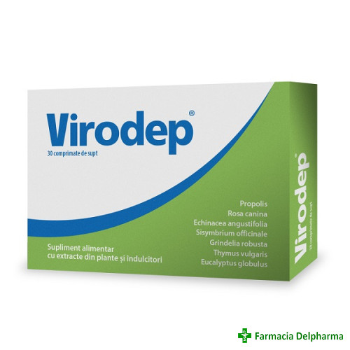 Virodep x 30 comprimate de suptVirodep comprimate de supt este un supliment alimentar pe baza de extracte vegetale standardizate si indulcitori. Complexul de ingrediente active naturale, din compozitia produsului actioneaza sinergic...