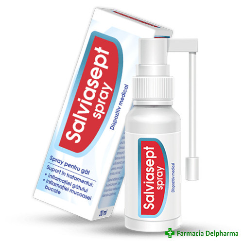 Salviasept gat spray x 20 mlAdjuvant în tratamentul: amigdalitei, inflamației gâtului, inflamației mucoasei cavității bucale, după îndepărtarea amigdalelor.Mod de utilizare:Se pulverizează 3-4 doze de 3-4 ori pe zi; perioada de utilizare nu trebuie s...