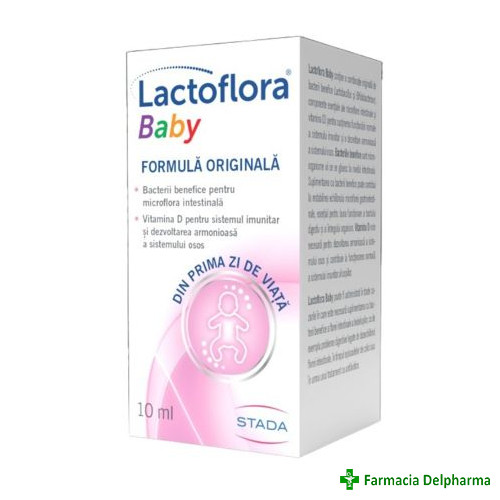 Lactoflora Baby picaturi x 10 mlProprietati:- poate contribui la echilibrarea florei intestinale la sugari si copii mici;- poate contribui dezvoltarea normala a microbiotei digestive;- poate contribui la digestia si absorbtia nutrientilor esentiali p...