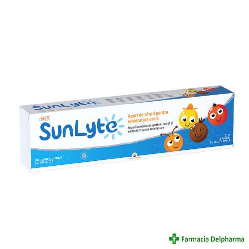 Sun Lyte x 8 plicuriProprietăți:- poate ontribui la evitarea deshidratării la copii;- compensează rapid lichidele şi electroliții pierduţi în caz de diaree şi/sau vărsături;- poate contribui la întreţinerea nivelurilor corespunzătoare de apă şi elect...