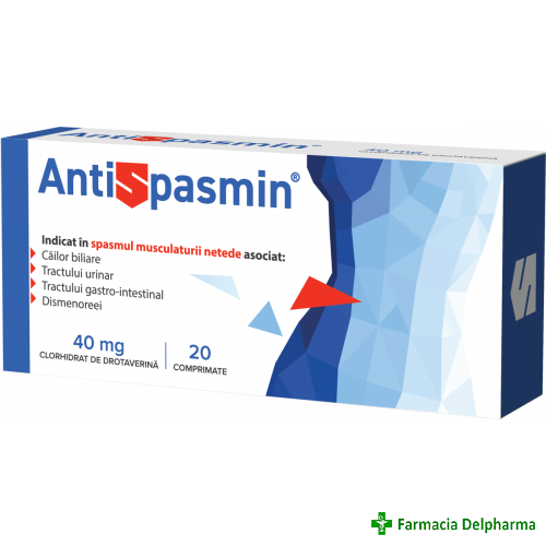 Antispasmin 40 mg x 20 comprimateIndicatii:Antispasmin® este utilizat pentru reducerea durerilor provocate de diverse colici (biliare, renale, vezicale, dureri din timpul ciclului menstrual, spasme uterine), ca antispastic în diverse afecțiuni digest...