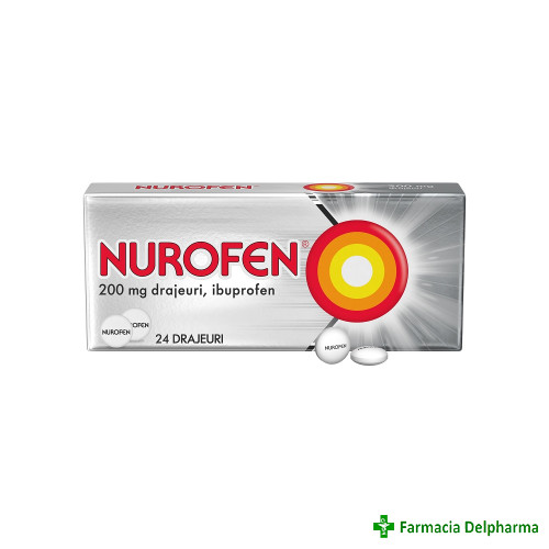 Nurofen 200 mg x 24 drajeuriIndicatii:Nurofen 200 mg conţine ibuprofen care aparţine unui grup de medicamente cunoscut sub numele de antiinflamatoare nesteroidiene (AINS). AINS acţionează prin schimbarea răspunsului organismului la durere, inflamaţie...