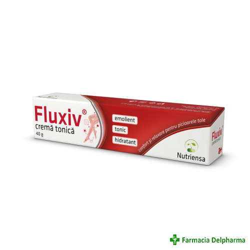 Fluxiv crema tonica x 40 gFluxiv cremă tonică este un produs cosmetic ale cărui ingrediente contribuie la menținerea elasticității, hidratării și tonicității pielii, asigură emolierea pielii, protejează microcirculația de la nivelul acesteia oferind ...