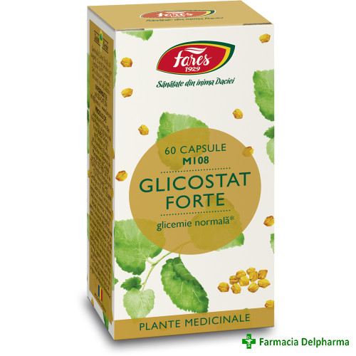 Glicostat Forte M108 x 60 capsuleProprietati:- formulă complexă din 8 plante medicinale ce pot contribui la reglarea glicemiei;- poate contribui la producţia de insulină, la reducerea rezistenţei la insulină, la inhibarea enzimelor care transfo...