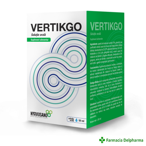 Vertikgo solutie orala x 50 mlProprietati:Suplimentul alimentar conţine o combinaţie de extract din frunze de Ginkgo biloba și extract din rădăcină de Ghimbir, plante cu efect benefic în menţinerea unei stări de sănătate optimă. Ginkgo biloba are în c...