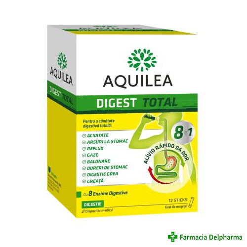 Aquilea Digest Total x 12 bucatiProprietati:- este un produs conceput pentru simptomatologie multipla care actioneaza rapid pentru a combate 8 simptome digestive: arsuri la stomac, aciditate, reflux, gaze, balonare, dureri de stomac, digestie grea si...