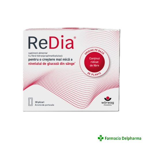ReDia x 30 plicuriProprietati:- este un complex patentat de fibre vegetale;- consumul de hidroxipropilmetilceluloza in timpul mesei poate contribui la o diminuare a cresterii nivelului deglucoza din sange dupa masa respectiva;- efectul benefic se obt...