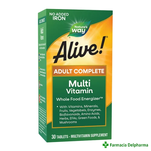 Alive Multivitamine (fara fier adaugat) Nature's Ways x 30 comprimateProprietati:- poate contribui la mentinerea tonusului, vitalitatii, metabolismului energetic normal si reducerea oboselii sau a extenuarii (mineralele: magneziu, calciu, iod, cupru,...